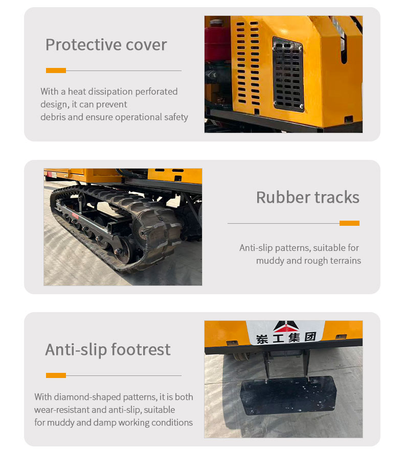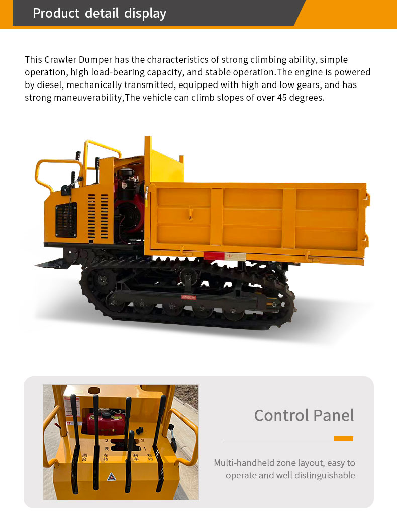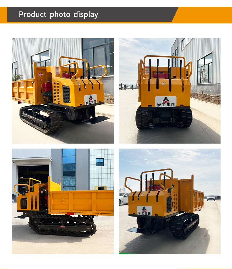 This crawler dumper features strong climbing ability, easy operation, high loading capacity and stable performance. It is powered by a diesel engine with mechanical transmission and high-low gear shifting, delivering excellent maneuverability. It can climb slopes over 45 degrees.